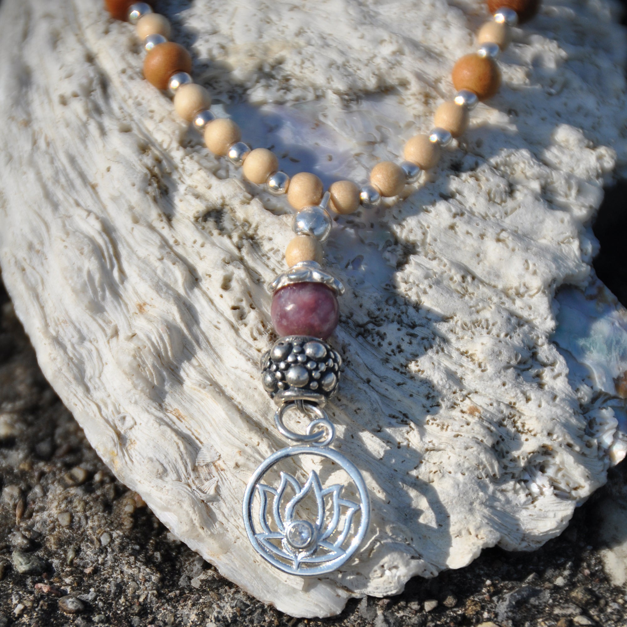 Natürlicher Halsschmuck mit Steinen, Holz und Symbolen. Diese Unikate und einzigartigen Halsketten vereinen harmonische Materialien mit bedeutungsvollen Symbolen.